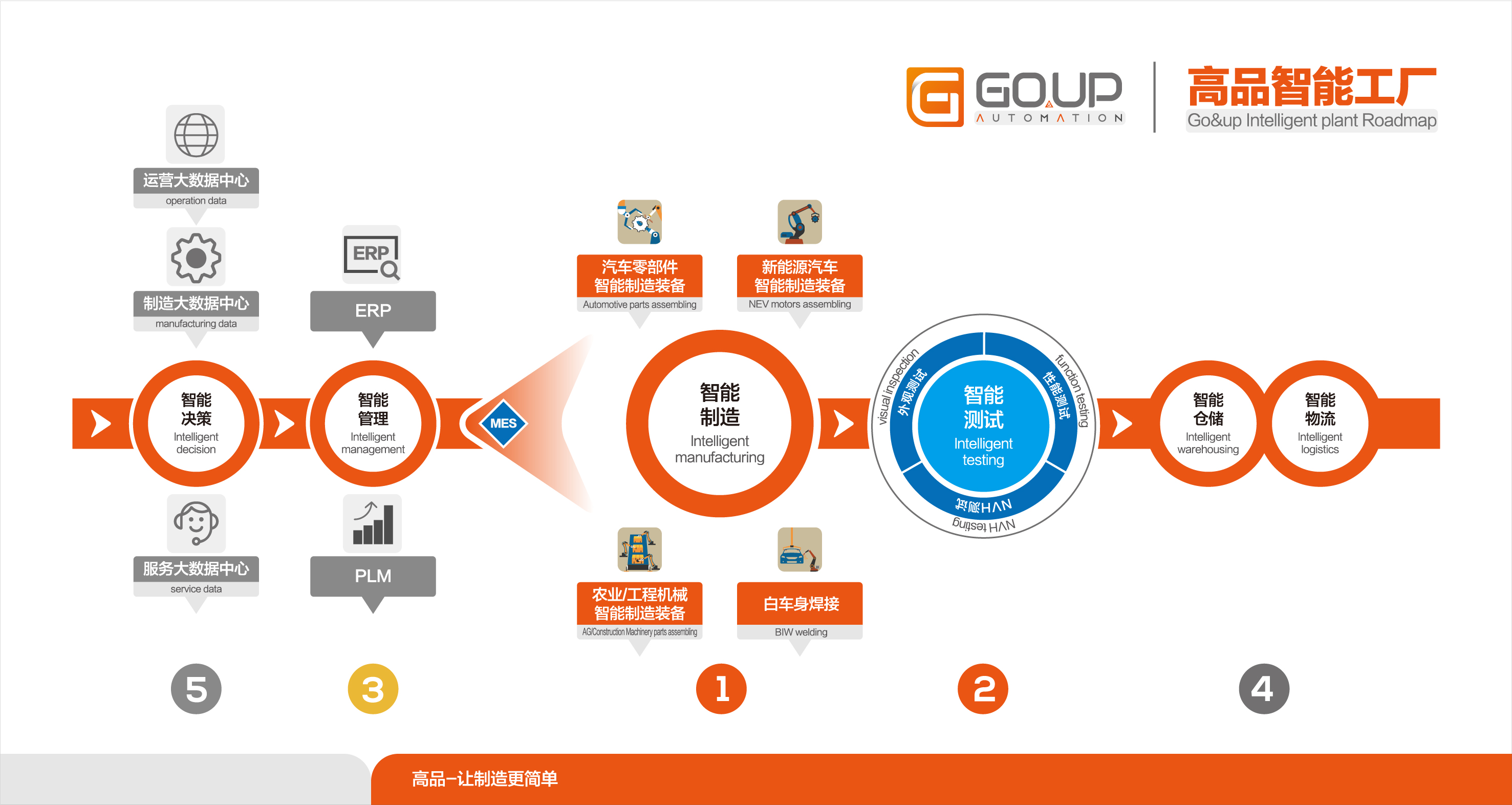 基于現(xiàn)有技術(shù)基礎(chǔ),高品提出“智能決策、智能管理、智能制造,智能測(cè)試,智能倉(cāng)儲(chǔ)物流”的智能工廠五步走技術(shù)路線: