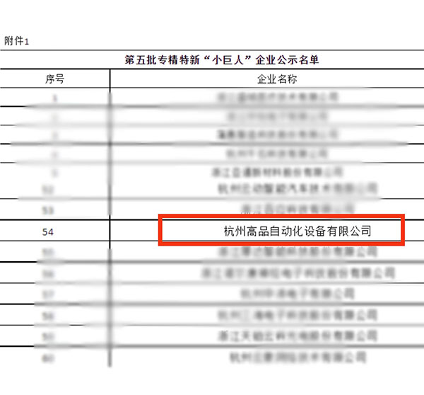 高品自動化入選浙江省專精特新“小巨人”企業(yè)