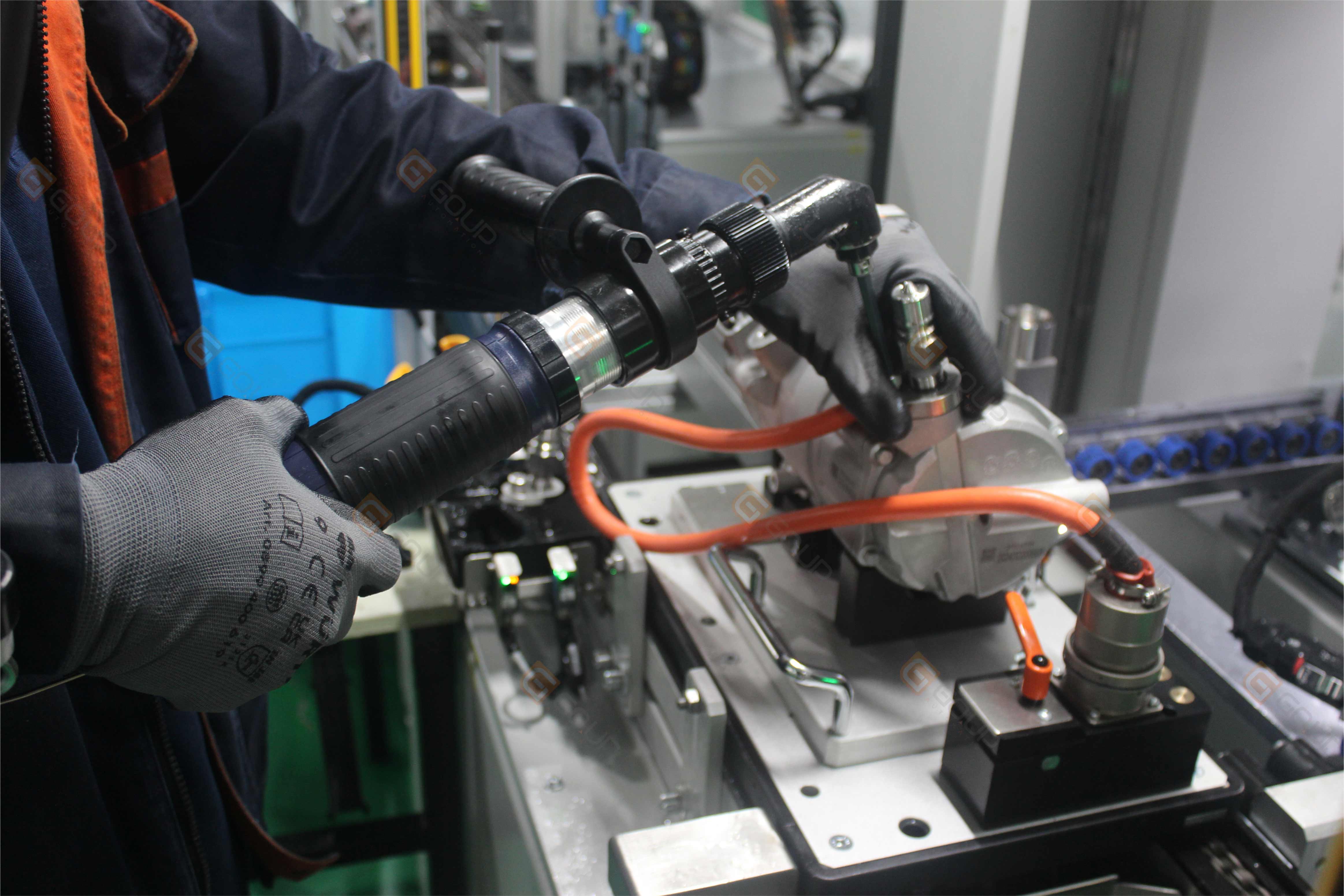 圖為高品同事正在為電動(dòng)壓縮機(jī)核心氦檢測(cè)工位設(shè)備調(diào)試