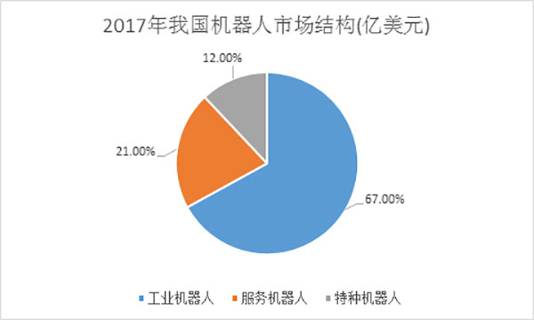 2017年我國機器人市場規(guī)模達到62.8億美元,2012-2017年的平均增長率達到28%。其中,工業(yè)機器人42.2億美元,服務機器人13.2億美元,特種機器人7.4億美元。
