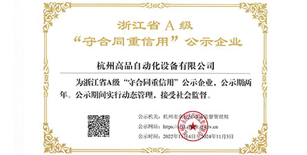 恭喜高品自動(dòng)化榮獲“浙江省A級(jí)守合同重信用”企業(yè)
