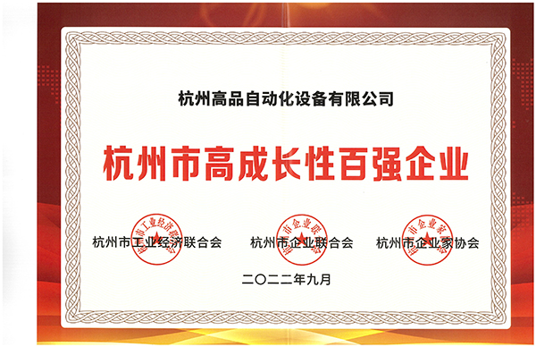 高品自動(dòng)化榮獲“杭州市高成長(zhǎng)性百?gòu)?qiáng)企業(yè)”榮譽(yù)稱號(hào)